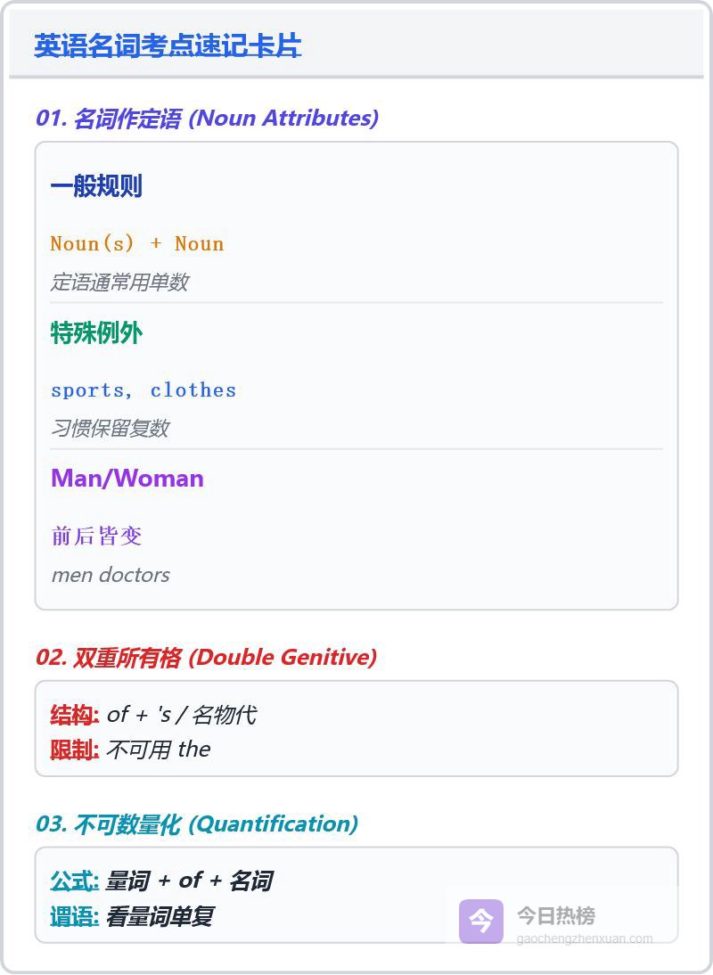 我在多年的教学观察中发现,名词板块往往是学生失分的重灾区。看似基础,实则陷阱重重。今天,我将围绕名词作定语、双重所有格、不可数名词量化这三大核心考点,为大家做一次彻底的拆解。我不讲虚的理论,只讲怎么考,怎么错,怎么对。