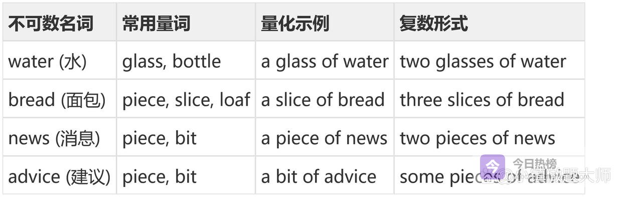 不可数名词不能直接加 s,也不能直接用数字修饰。这是基本概念。但在实际交流中,我们需要表达"一杯水"、"两片面包"。这就涉及到量化结构。