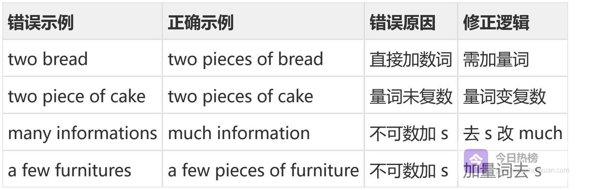 易错点在于量词本身的复数变化。很多学生记得名词不可数,却忘了量词要变复数。比如"two piece of paper"是错误的,必须是"two pieces of paper"。这是考试中最常见的陷阱。