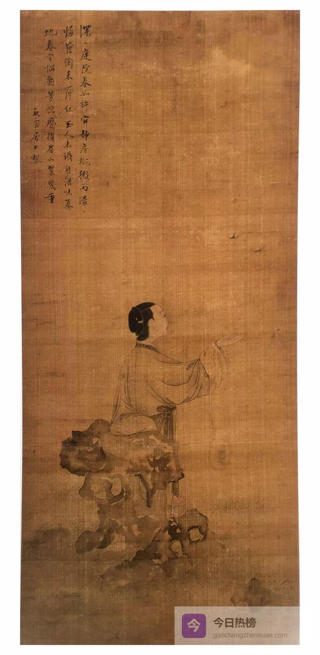 素有“余美人”之称的余集,少负奇才,官至翰林院侍讲学士。诗文、书、画兼擅,有三绝之誉。尤其擅画仕女,风神清丽,仪态静朗,无脂粉气。《仕女图》画深幽庭院,除太湖石外,别无景物。仕女侧对观者,体态清秀柔弱,倚石而立,右手托举空中,似欲接归燕衔来的花瓣,人物形象显得仪态万方。人物画部略敷白粉,粉黛轻扫,朱唇微染,衣纹线条劲紧流畅。