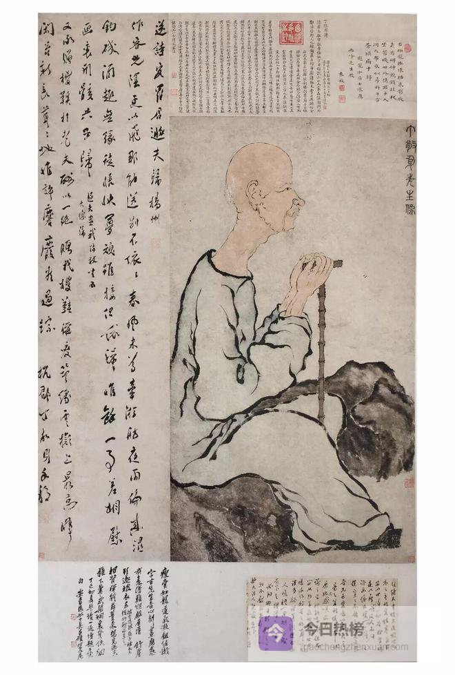 金农青年便与丁敬交好,二人经常诗文唱和、书画相赠。受金农影响,学生罗聘也十分敬重丁敬。罗聘所绘《丁敬像》画中丁敬倚杖侧坐石几,光顶高额,脑后仅剩稀疏白发,脖颈细长,颈关节裸露,造型夸张,“怪”中见美,拙中含趣。衣纹线条以浓墨莼菜条勾勒,转折顿挫坚挺洒脱,花青平涂衣衫,衬出丁敬“瘦骨如龙、道气凝鉏”的不凡气质。此像构思造型别出心裁,发展了金农的肖像画法,追求文人画的天趣、人趣与物趣,为传统肖像画开拓出新的生机。袁枚在诗堂上题云“看碑伸鹤颈,拄杖坐苔矶。”罗聘画中有诗,袁枚诗中有画,诗画呼应,相得益彰。该图与《金农像》相类,亦无作者年款,据裱边丁敬手书《送诗客罗君遁夫归扬州》诗及丁敬致罗聘书箚,得知此像并非受命之作,而是罗聘出于对前辈敬仰之情,在杭州画成后携归扬州,留作纪念。据黄涌泉先生考证,此图创作时间可能是乾隆二十八年春天(公元一七六三年),是年丁敬六十九岁,罗聘三十一岁。