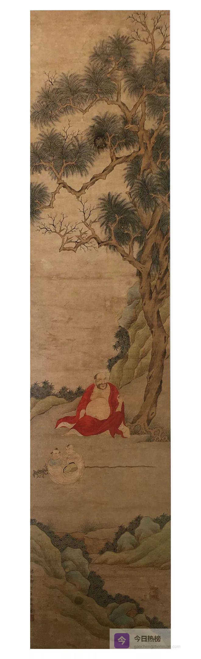 被丁云鹏推为赵伯驹后身的郑重,善写佛像,亦画山水小景,摹仿宋、元体均气韵精研。郑重《罗汉图》画一红衣罗汉,须发卷曲,双耳垂肩,坦胸露肚,趺坐于菩提树下。罗汉头微向左上扬,双目注视前方,眉眼之间洋溢着慈爱、平和的神情,左手执一白色物件,似向童子讲述故事,而三童子顾自坐在布袋里嬉戏。山水之间充满了天真、祥和的情趣。佛教自宋代以来已开始逐渐趋向世俗化,至明朝则这种世俗化的倾向愈益明显,郑重笔下的罗汉显然减少了几分道释画应有的庄严神圣。更多的是凡间世俗的亲切与平易。
