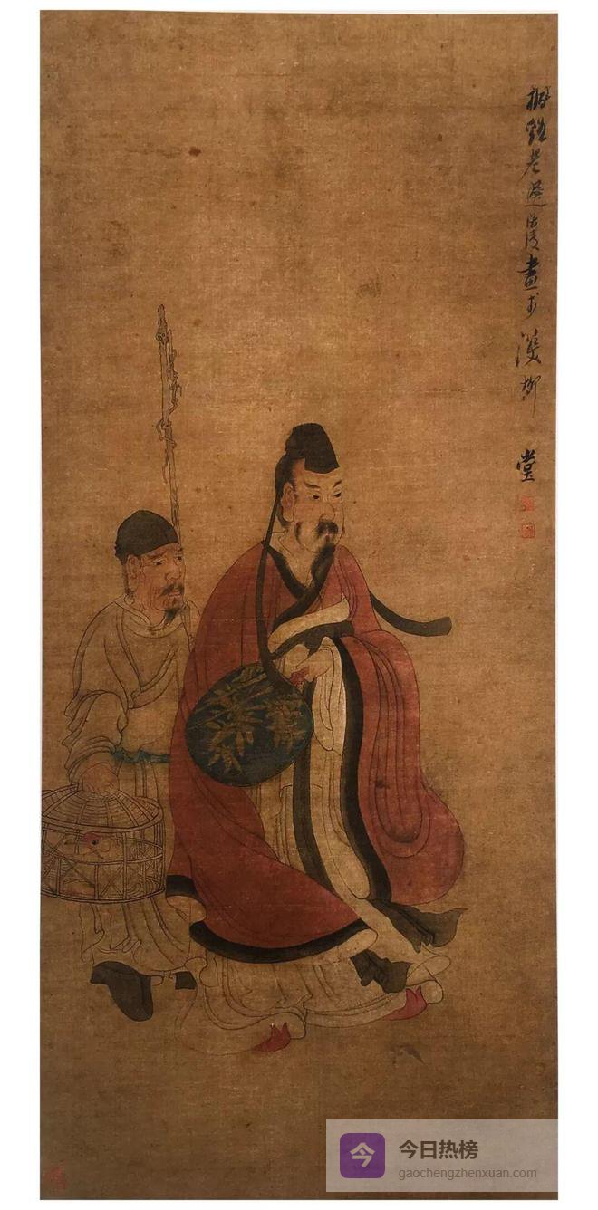 如《羲之笼鹅图》写晋代大书家王羲之以字换鹅故事。图中王羲之头戴峨冠,身着宽袖敞袍,手执蓝底描金竹枝纨扇,神情悠闲潇洒。家仆左手执杖,右手提鹅笼,紧随其后。人物躯干伟岸,造型夸张,主仆二人形象准确生动。敷色妍丽古雅,衣纹线条圆劲流畅,具有古朴的韵律。陈洪绶的人物画对清代及海上书派的任熊、任薰、任颐等影响极大。