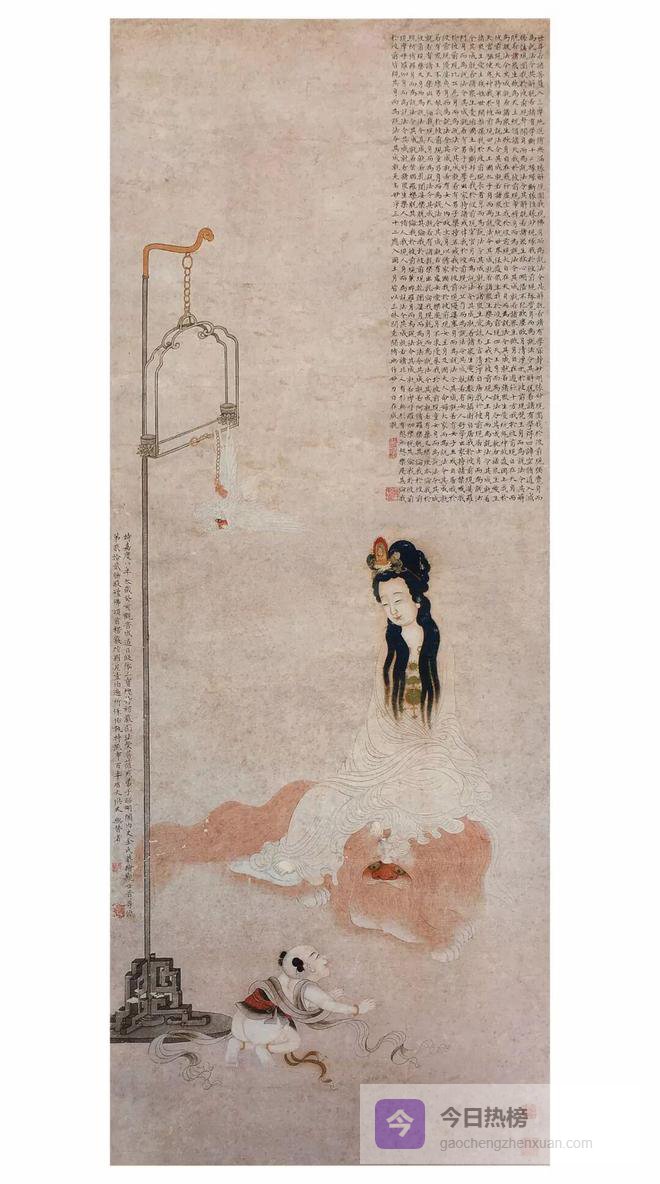 观音作为佛教中的重要人物形象,成为救苦救难的象征,是人间福祉的化身,因此无论在戏剧还是在文学创作中,观音都是以慈眉善目的女性形象出现。浙江籍女画家金礼嬴,自幼即含毫吮墨,志趣高远。凡人物、仕女、界画楼室、山水、花卉,都能匠心独运,妙夺古人,尤其精于画佛像,庄严妙丽。