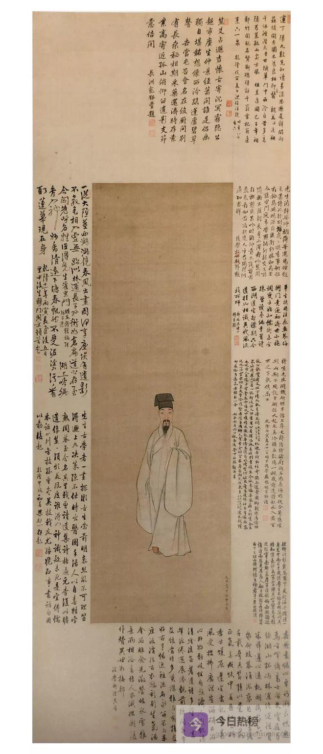 曾鲸弟子张远《槐荫抱膝图》为海宁名士查慎行写像,此卷作于康熙二十一年壬戌(公元一六八二年),时年慎行三十三岁。画本幅无款,朱彝尊题引首“槐阴抱膝”,查初白自题七绝一首,卷尾有张尚瑗、钱良择、陆嘉淑、杨雍建、高野侯、张宗祥等名流题咏。图中浓密的槐树荫下,慎行端坐磐石,双手抱膝,眉目清秀,神情间若有所思。该图与曾鲸写真技法一脉相承。无怪乎画主于二十年后非常得意地在画上自题诗云:“道是故吾浑不识,笑将颜状向旁人”。