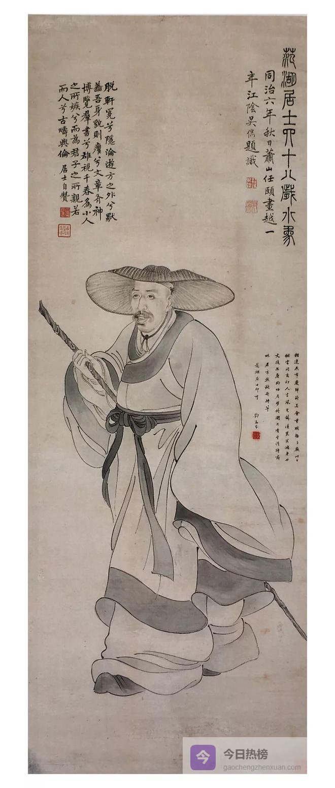 在海派中占有重要地位的人物画家任颐堪称海派人物画之巨擘,他对传承发扬晚清人物画具有举足轻重的作用。任颐之前的写真像像主多为正襟危坐,即使是把人物安置于一定的背景环境中,或是站者、坐者,或是全身、半身,也都是正面形象居多,以表现像主安详从容的神情。而任伯年所作肖像画,或正面、或侧面、均视画面需要而定,通过像主的眼神、身姿、手势和其他细节来表现人物的性格。《周闲像》是为浙江嘉兴名士周闲四十八岁时绘制的小像,而作者年方一十八岁。周闲是海派早期画家,寓居吴门,鬻画为生,善画花卉,气象沉厚。兼工仕女,有陈老莲风采。周闲“性简傲,喜远游”颇具魏晋风度。为凸现周闲名士风采,画家构图力求简洁,画面一无背景,图作像主全身像,头戴笠帽,身着古装宽袖大袍,右手持杖,神情淡定从容,旁若无人地大步行进街头。人物衣褶线条劲紧流畅,风生水起,一个桀惊不驯、才高八斗的鲜活形象仿佛即将从画中走出。