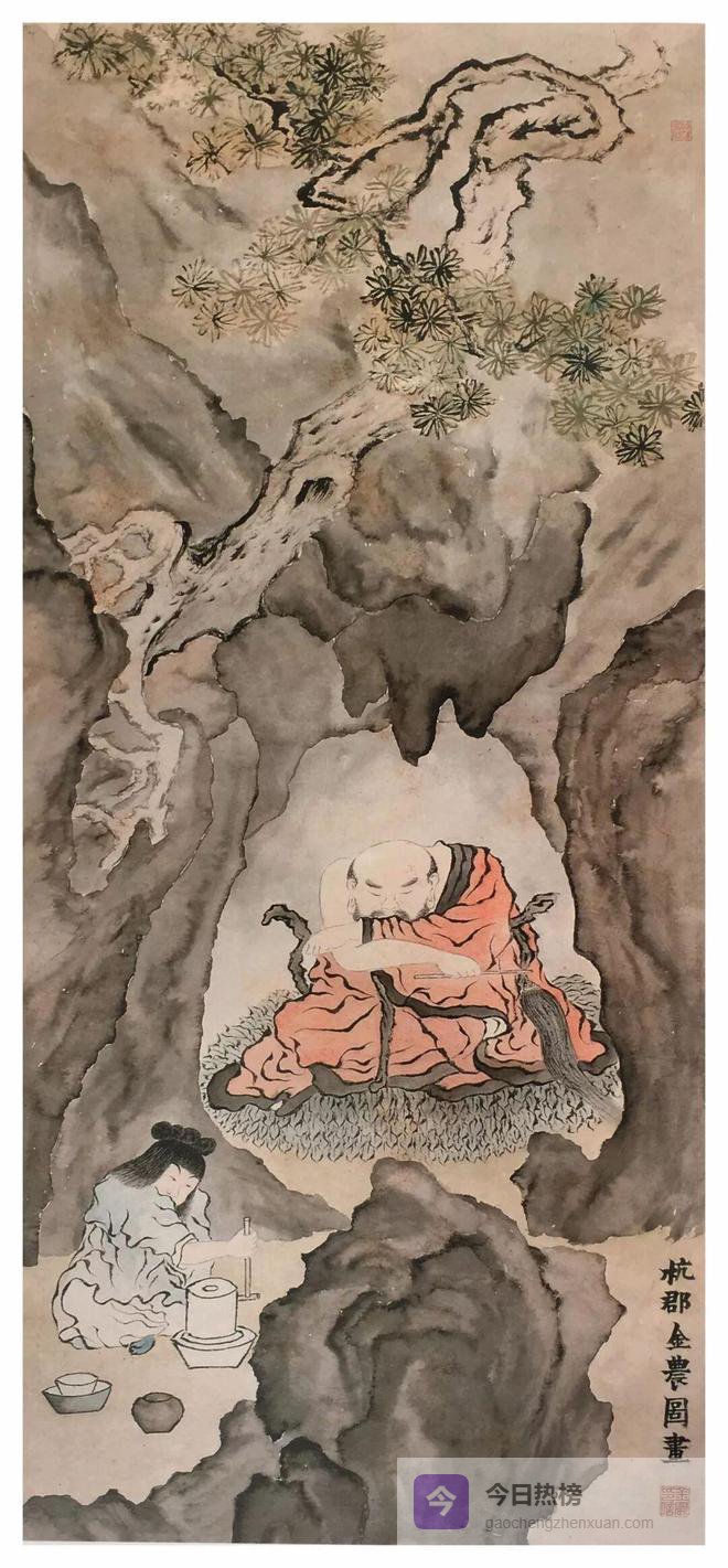 药师佛是东方琉璃净土的教主。药师本用以比喻能治众生贪、瞋、痴的医师,在中国佛教一般用以祈求消灾延寿。金农擅长诗文、书法,中年后才涉足画坛,他流传至今的人物画并不多,但却能形成独特的风貌,凭借著书法用笔的功底,他的人物画逸笔草草,力求捕捉人物的神态特征。《药师佛像图》以虚虚实实的线条信手勾勒出山石轮廓,水墨平涂,山石一无皴染,洞内药师佛着朱衣袈裟,袒露右肩,盘踞蒲团,手执尘掸作闭目养神状,洞外有小童推磨碾药。人物神态特征捕捉准确,衣纹线条顿挫有力,从中可窥金农以书法入画的成功个例。