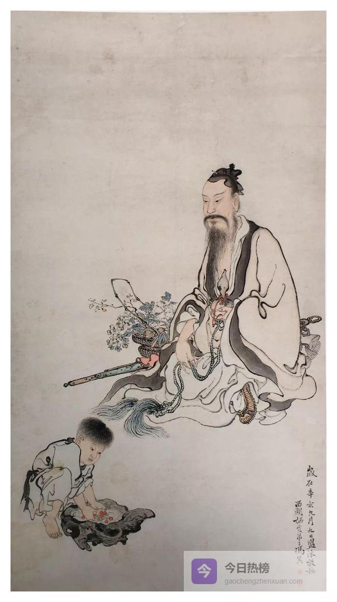 道教题材的人物画有仙道故事、道教人物和道场画之分。道教画中最为常见的是对于神话传说中“八仙”的描绘,“八仙”是道教供奉的民间广为流传的八位得道仙真;钟离权、张果老、吕洞宾、李铁拐、何仙姑、蓝采和、韩湘子和曹国舅。在以“八仙”为主题的道教画中,有将“八仙”共置于一幅画的,也有仅画一个或两、三个的。“八仙”之一的吕洞宾是一位与观音、关公一样妇孺皆知、香火占尽的人物,他们合称“三大神明”。冯箕《吕洞宾像》仅画吕洞宾一人,身穿道袍,头戴华阳巾,身着青锋剑,左手持三宝神水宝瓶,席地而坐,神情慈善地注视着洗樱桃的童子,童子专注投入的样子憨态可掬。人物面部描绘笔墨工细,别具神采。整个画面风格淡雅,张力十足。