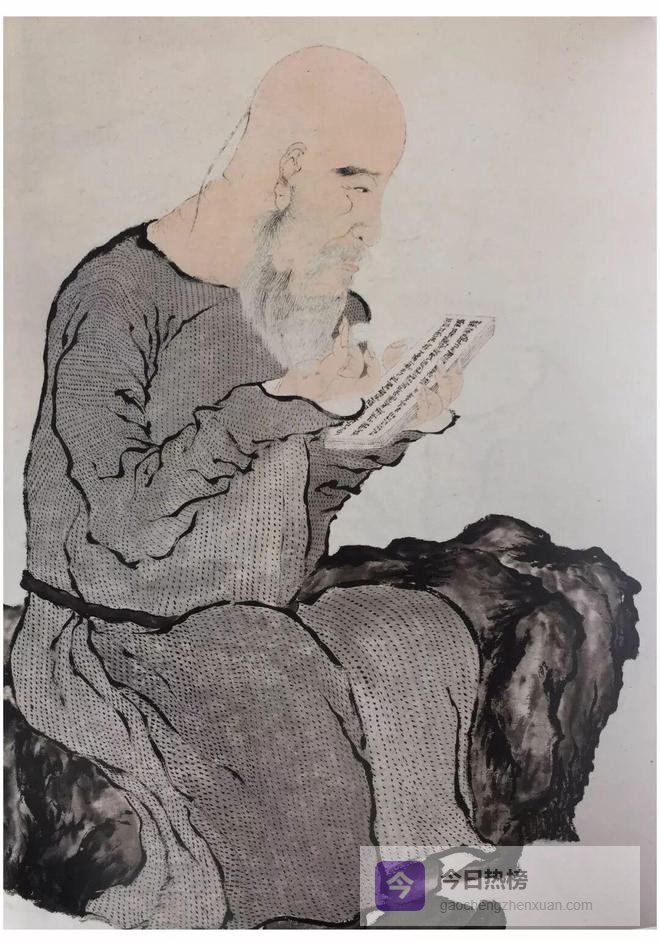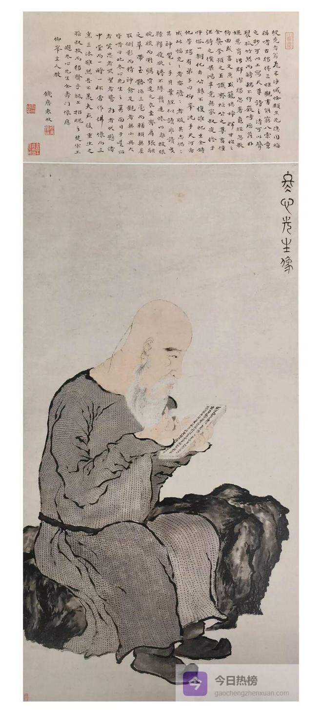 “扬州八怪”中罗聘堪称写真高手,身为金农入室弟子,既继承师法,又不拘泥于师法,笔调奇特,自创一格。将罗聘笔下的《金农像》与《金农自画像》(故宫博物院藏)相比较,可知金农长得就是秃头大脑门这副尊容,画家并无刻意强调不求形似。为使金农显得精神矍铄,作者取金农侧面坐于山石上,手捧贝叶经作读经状。画像抓住金农秃头大脑门、胡须连蜷、服装简朴的特徴,突现了金农淡定从容,嗜奇好古而又落拓不羁的性格。头部轮廓以淡枯笔勾勒,人物皮肤皆施淡赭色。胡须显杂乱施白粉,并以浓墨粗线条勾勒衣纹轮廓,以坚劲扎实的点子积成线条,构成粗布条纹玄色衣衫的效果,线条古朴生拙,从中可窥罗聘笔墨的深厚功力。《金农像》无作者年款,但从所画人物造型、笔墨和衣褶线条分析时间与《丁敬像》相近。