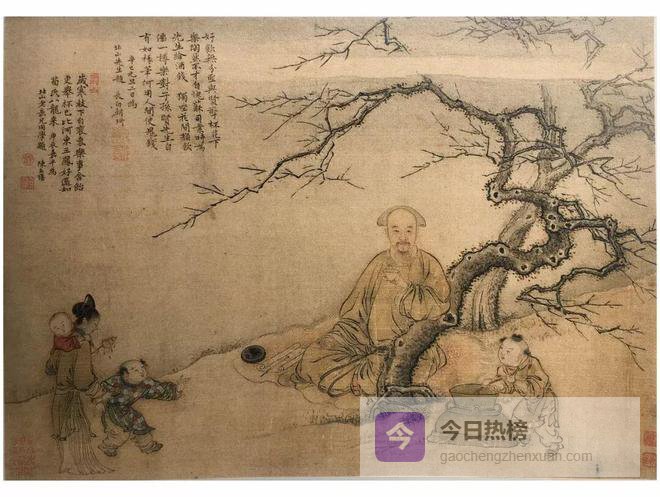 康熙年间以擅人物画而供奉内廷的禹之鼎,山水画师法蓝瑛,兼学宋、元诸家,白描写真,秀媚古雅,尤精肖像,一时名人小像多出其手。喜用兰叶描,取宋代马和之法,简逸飘洒,亦能花鸟,名重一时。《北山洗寒图》朱北山即朱自恒,该图绘北山先生裾坐于古梅树下,饮酒洗寒,神色潇洒自若,表达了画主以梅作友,借酒为饮的傲骨。画中梅枝虬劲,暗香浮动,周围衬以妇人、幼子及调酒小童,为整个画面增添了动人的神采。