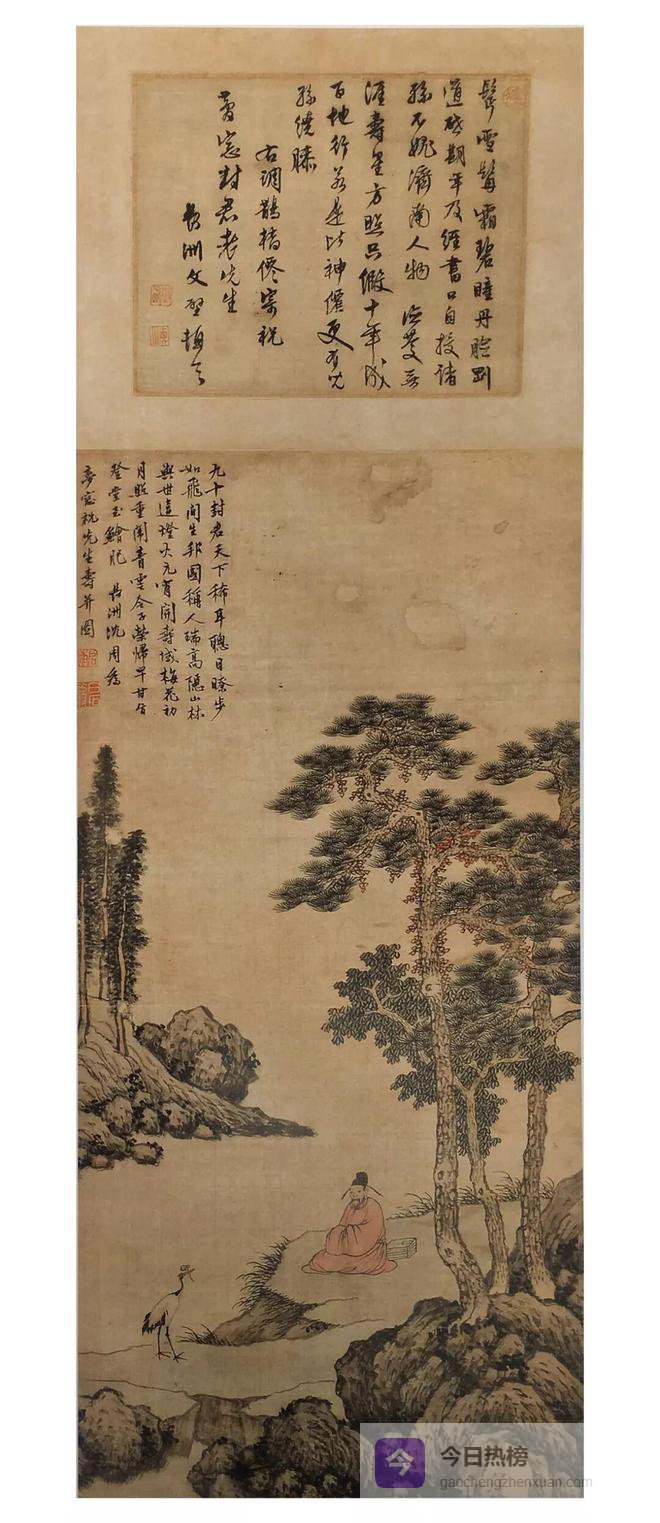 明代出现了人物与山水相结合的画,整体看以山水为主体,但画中人物突出,足以表现人物的活动。沈周《为祝淇作山水图》,便是一幅将画主置于自然山水中的作品。为贺祝淇九十高寿,沈周应命而作,图中画主身着红袍,头戴玄纱冠,双手笼于胸前,端坐于流水之滨。神情闲雅。丹顶鹤口街灵芝向祝淇献寿。旁衬参天古松,寄托了作者对画主延年益寿的美意。