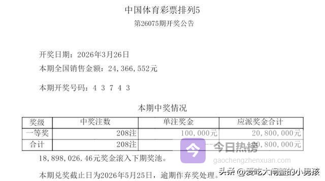 中国体育彩票排列5第26075期于2026年3月26日开奖,本期全国销售金额为24,366,552元,开奖号码为4 3 7 4 3。
