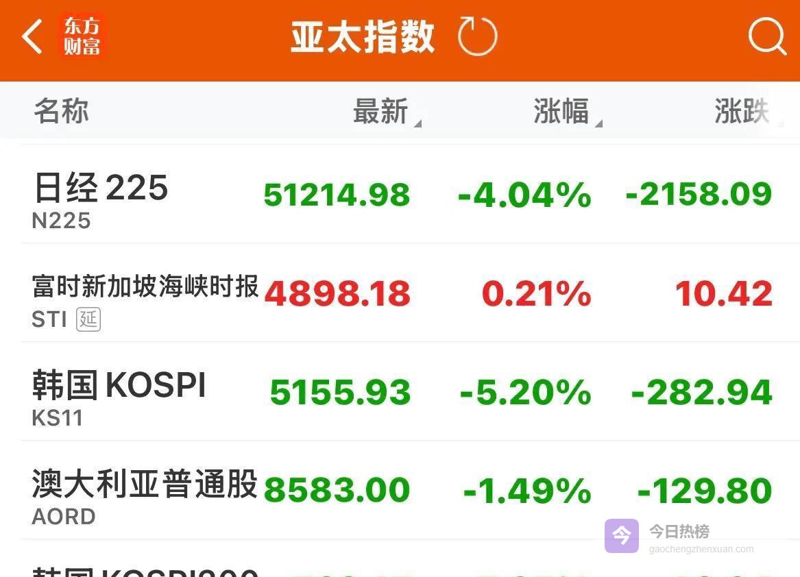 日经225指数跳空低开4.04%,韩国综指更狠,跳空低开5.21%。
