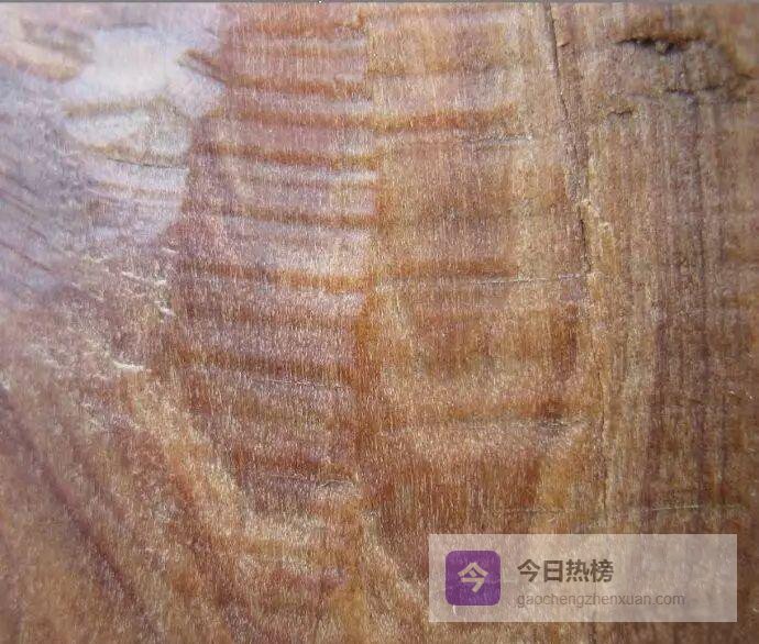 看油线:断面打磨后,棕黑油酯线清晰可见,导管(粽眼)密布;