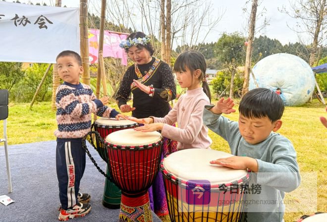 另一边,禾丰镇连山村的“声舞欢乐营”也热闹非凡。孩子们整齐排列,跟着志愿者老师的节奏,感受着民族舞的独特魅力,抬手、转身、踏步,每一个动作都充满童真与活力。非洲鼓体验活动更是欢乐,在志愿者老师指导下,大家从生疏胆怯到熟练流畅,敲击出明快有力的节奏,传递着他们内心的喜悦。