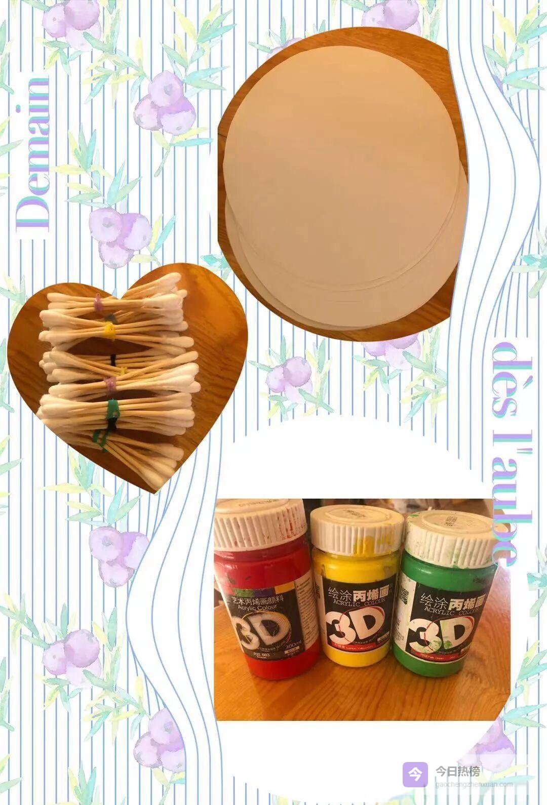 2.1 ❒ 黄点打底——树冠的轮廓老师先示范: “左手按纸,右手握棉签,蘸满黄色,轻轻点在纸中央。”