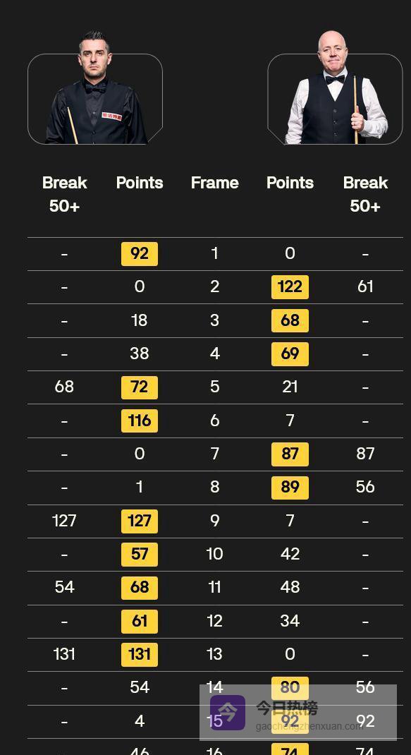 另一场焦点战在两位传奇老将之间展开。 卫冕冠军约翰·希金斯对阵马克·塞尔比,这仿佛是去年决赛的重演。 第一阶段,希金斯以5比3取得领先。 然而进入第二阶段,场上风云突变。
