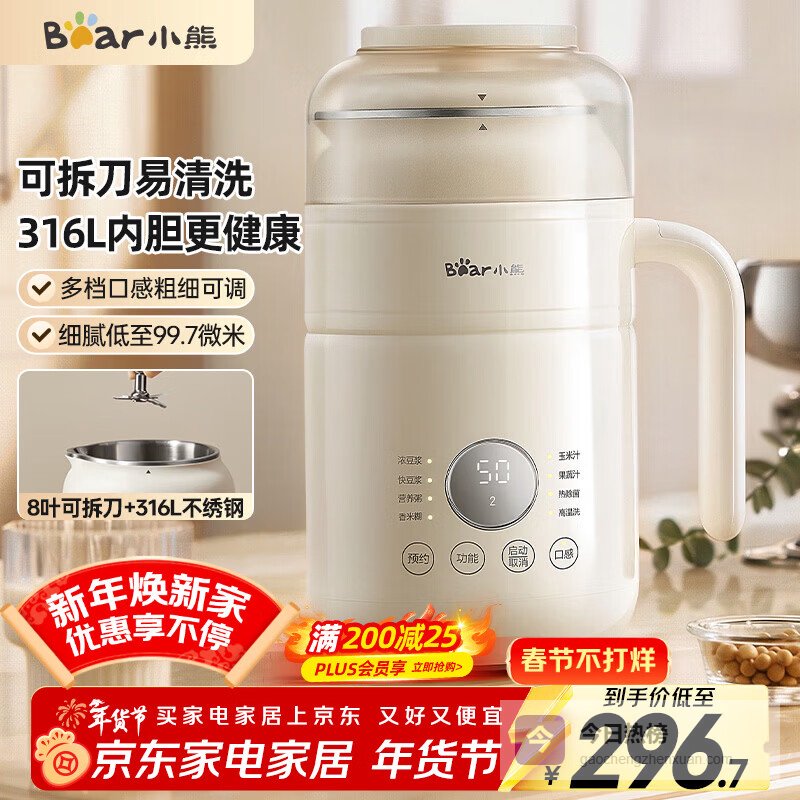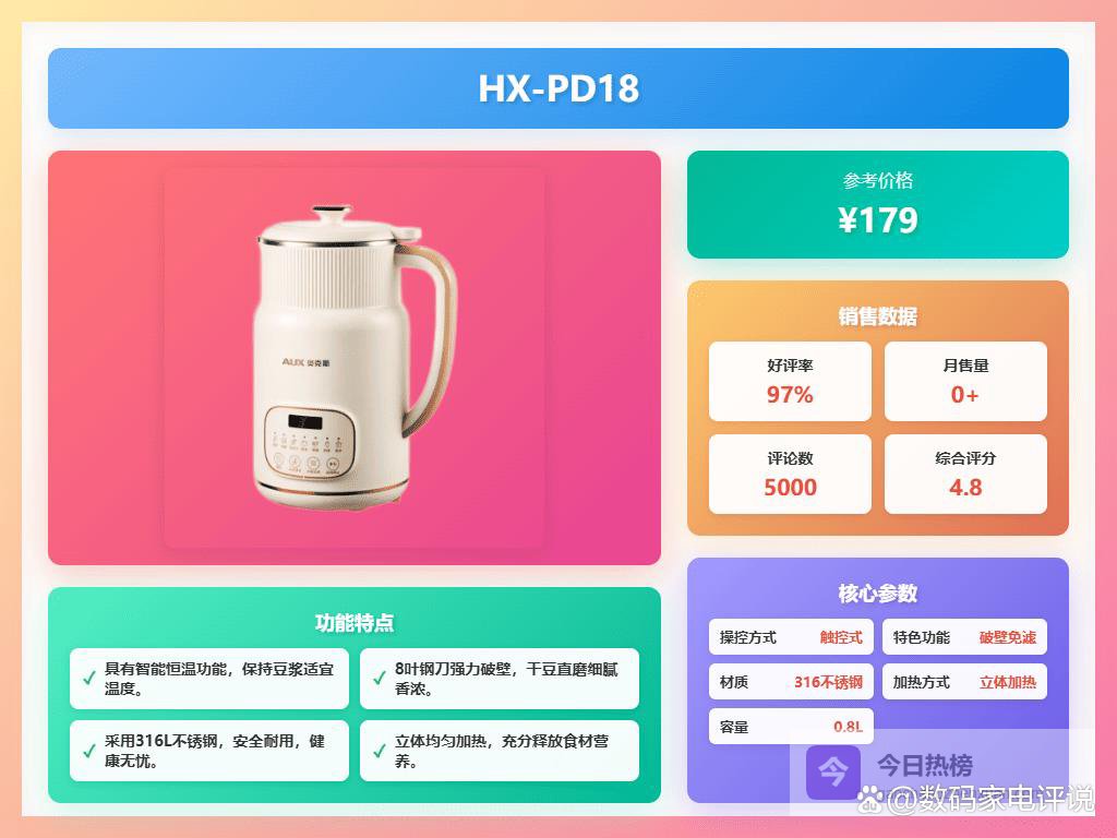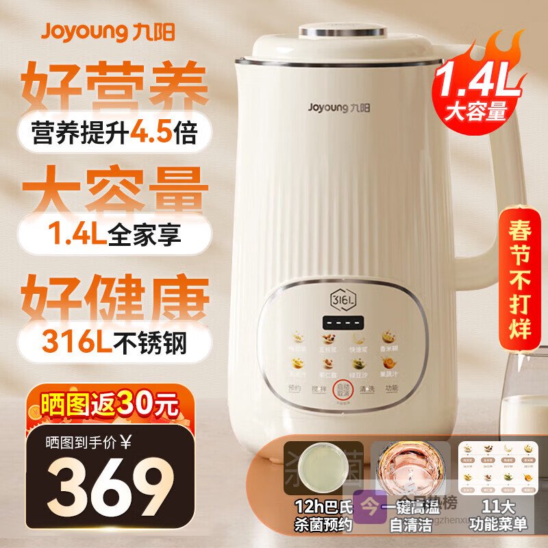 多功能一身:不仅能做豆浆,还可以榨果汁、烧水、温热牛奶,冷热都能搞定。它支持干豆直打,不用提前泡,免滤设计省事又快,制作出来的豆浆口感细腻,丝滑顺爽,轻松应付不同需求。