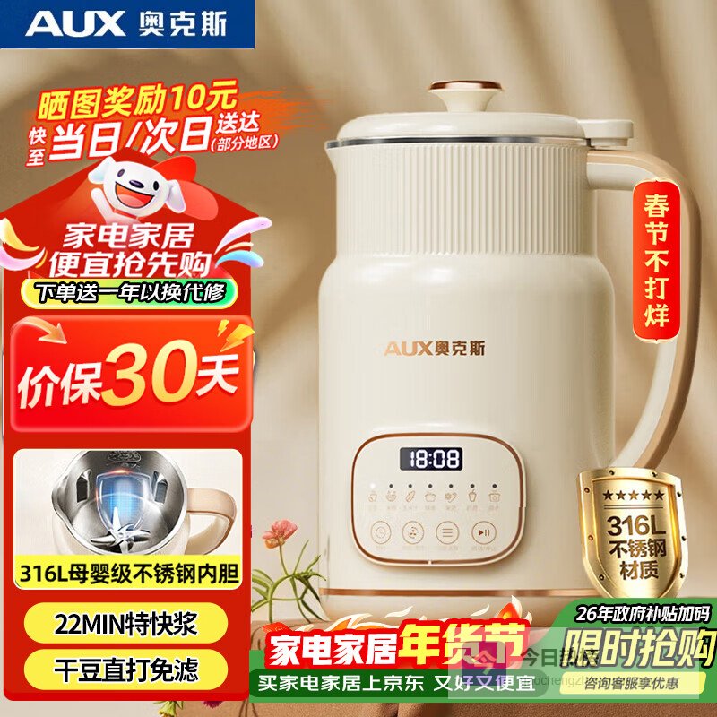奥克斯(AUX)【316不锈钢】豆浆机0.8L小型多功能破壁机预约时间一键清洗1-3人免滤全自动免煮2025新款HX-PD18¥