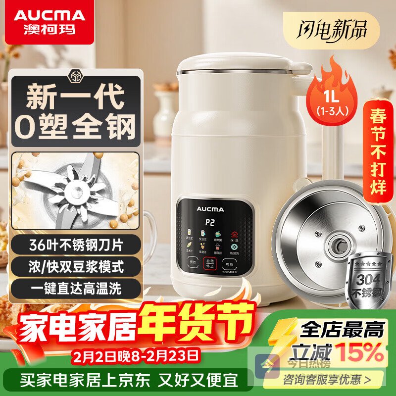 澳柯玛(AUCMA)钢盖豆浆机小型1人-2人-3 五谷杂粮破壁机 免手洗辅食料理机1L 全自动免煮新款静音免滤米糊机 M55¥