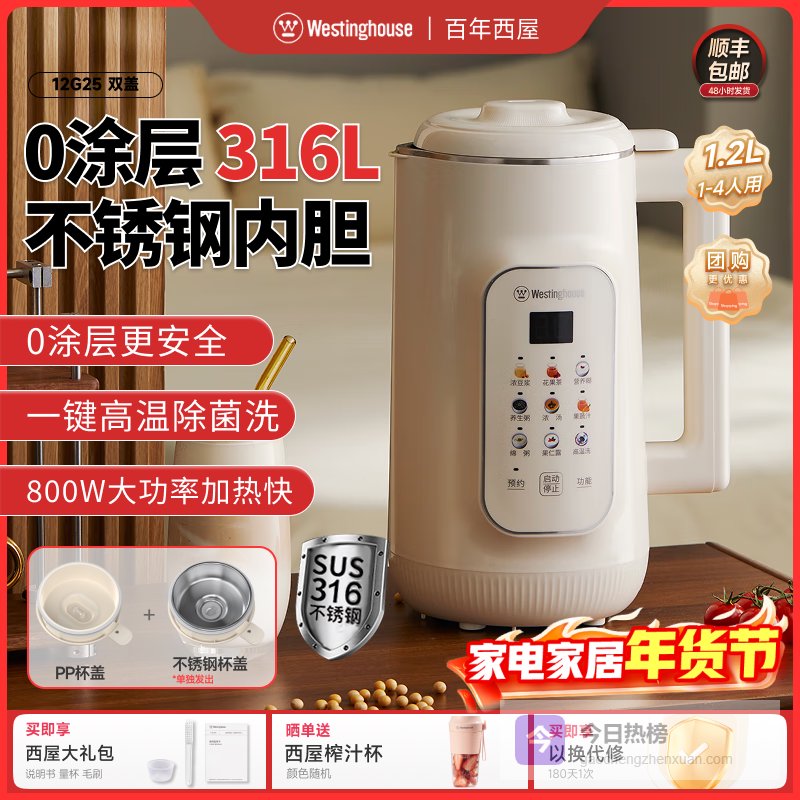 西屋豆浆机2025新款家用冷热双打榨汁机316L不锈钢免泡免滤破壁机 杏仁白 1.2L 不锈钢杯盖【双盖】¥