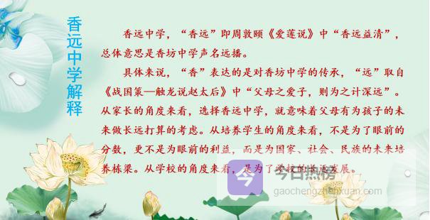 更名不更心。香远中学继续高举“爱·成就未来”的办学理念,锁定“办有品位的教育、创有特色的学校、做有魅力的教师、育有涵养的学生”四大目标。