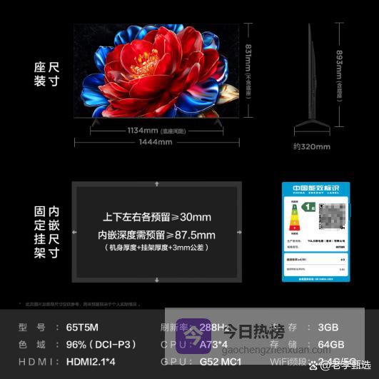选购建议:适合注重实用便捷与性价比的家庭,TCL 65T5M型号,65英寸大屏适配客厅,QD-Mini LED控光技术保障优质画质,送装一体+固定挂架省心省力,智能系统操作流畅无广告,AI画质增强优化观影体验,支持国家补贴性价比突出,运行稳定、兼容性强,能满足家庭日常观影与娱乐需求,安装便捷、使用省心,适配各类实用型家居场景。