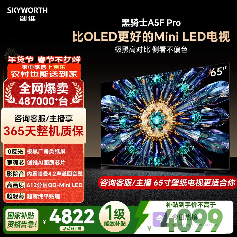 选购建议:适合注重画质与音质双重体验的家庭,创维A5F Pro型号,65英寸大屏适配客厅,612分区QD-Mini LED保障细腻画质,极黑类纸屏护眼舒适且防反光,哈曼回音壁带来影院级音质,支持国家补贴性价比突出,智能操控便捷,运行流畅,能为全家带来沉浸式观影与听觉体验,适配高品质家居娱乐需求。