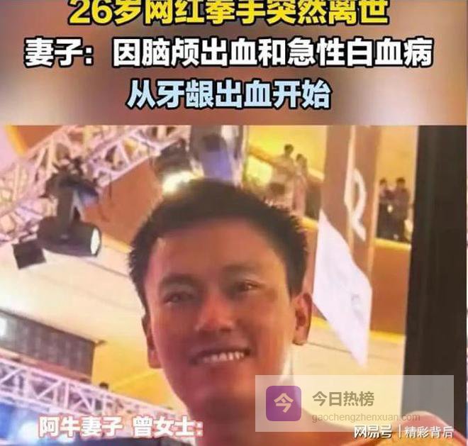 也是在同一天,广州传来另一个噩耗,26岁的网红拳手阿牛,本名田岩映,因急性白血病并发脑颅出血,经抢救无效离世。