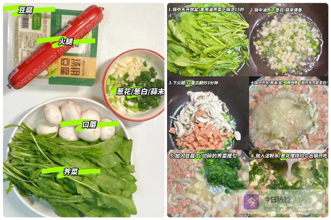 食材:荠菜、嫩豆腐、口蘑、火腿、青葱、蒜、淀粉、胡椒粉
