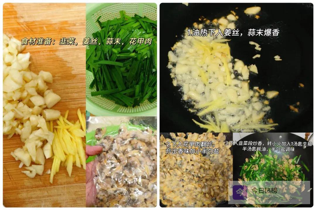 韭菜洗净切段。花甲肉洗净,可用新鲜的,也可以用冰鲜的。花甲肉本身就鲜,不需要复杂的处理。