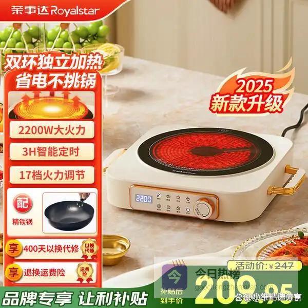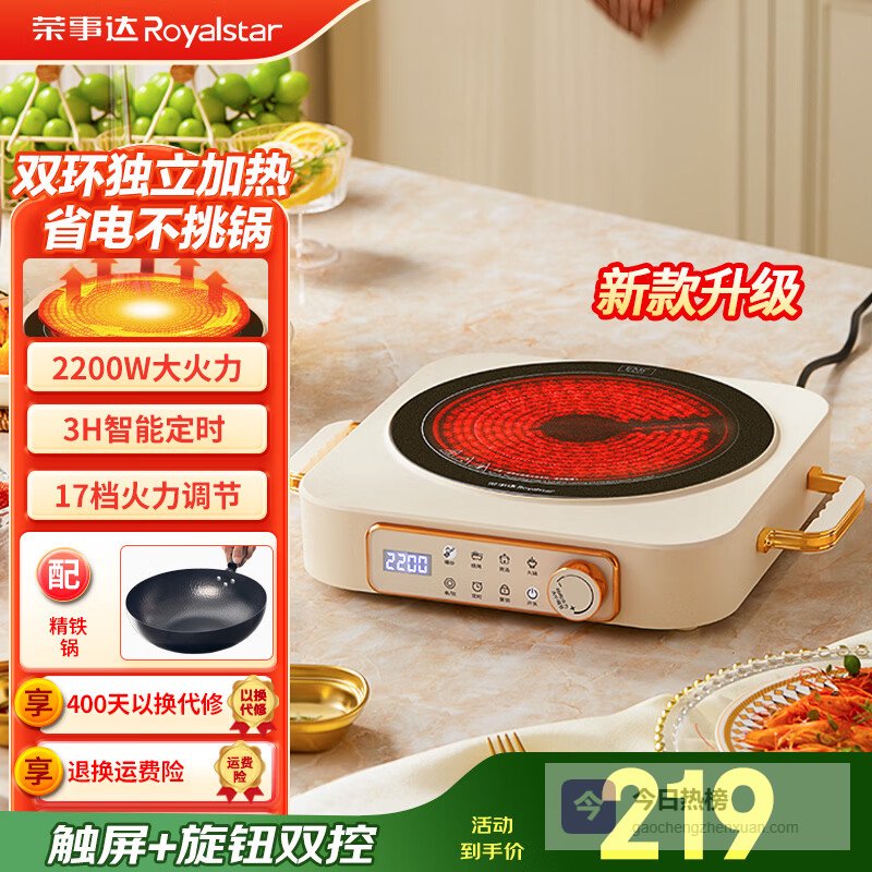 荣事达(Royalstar)电陶炉电磁炉家用爆炒炒菜火锅2200W大功率电磁灶2026新款智能定时煮茶炉低辐射烧水电热炉不挑锅 数显双环款【单炉+精铁锅】¥