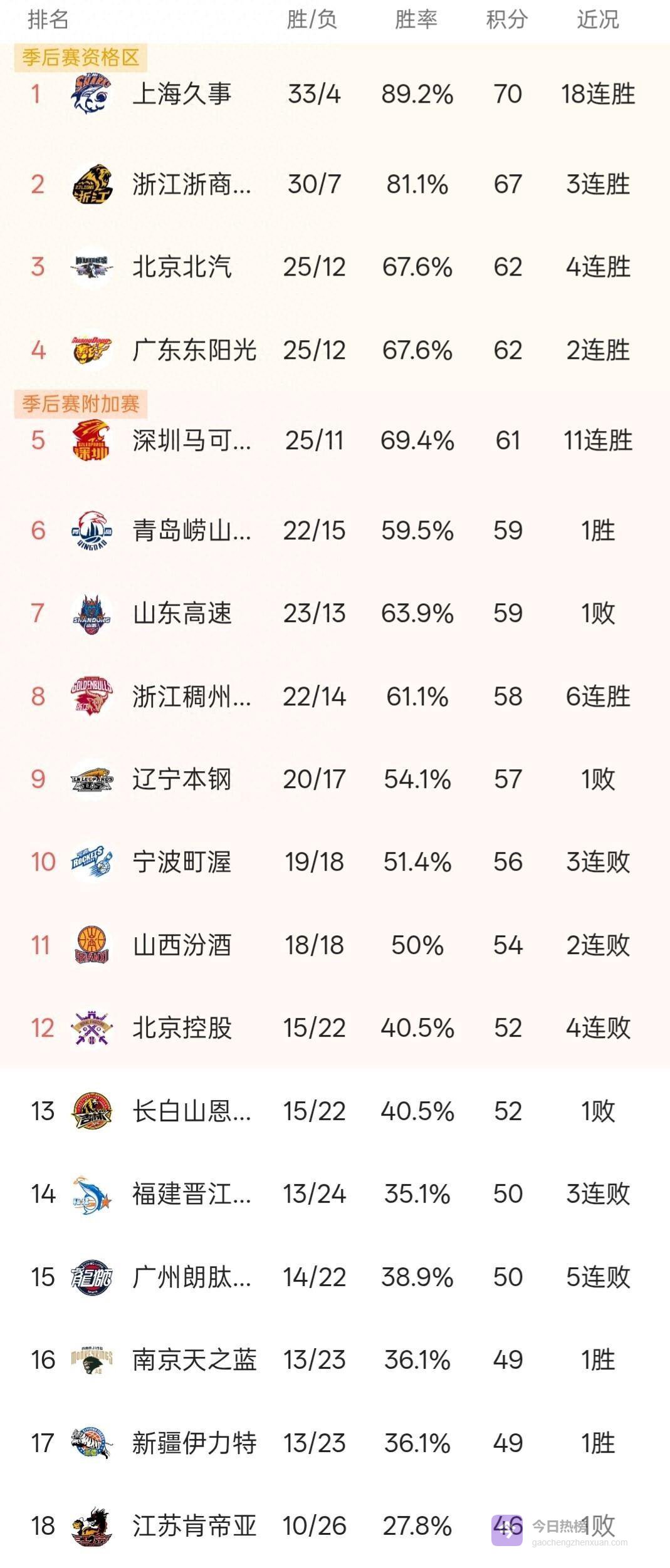 北京北汽男篮客场84-65大胜北京控股,战绩25胜12负积62分,凭借胜负关系优势排在第三名。