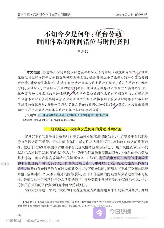 本研究以平台劳动时间体系与媒介时间理论为分析框架,聚焦生鲜电商分拣员的劳动实践,探讨深度媒介化社会中时间秩序的重构与资本剥削逻辑。研究发现,媒介时间已成为平台劳动的主导时间维度,并与自然、社会、生理、钟表时间形成四重隐性错位,平台资本借此实现跨维度的时间套利。劳动者在认知错位中将“进出自由”误读为时间权力,却陷入持续的时间消耗与劳动异化。研究揭示数字技术理性对生命节律的系统性解构,并提出以“时间调校”重建时间正义与主体尊严,为理解平台劳动的时间政治提供了全新解释路径。