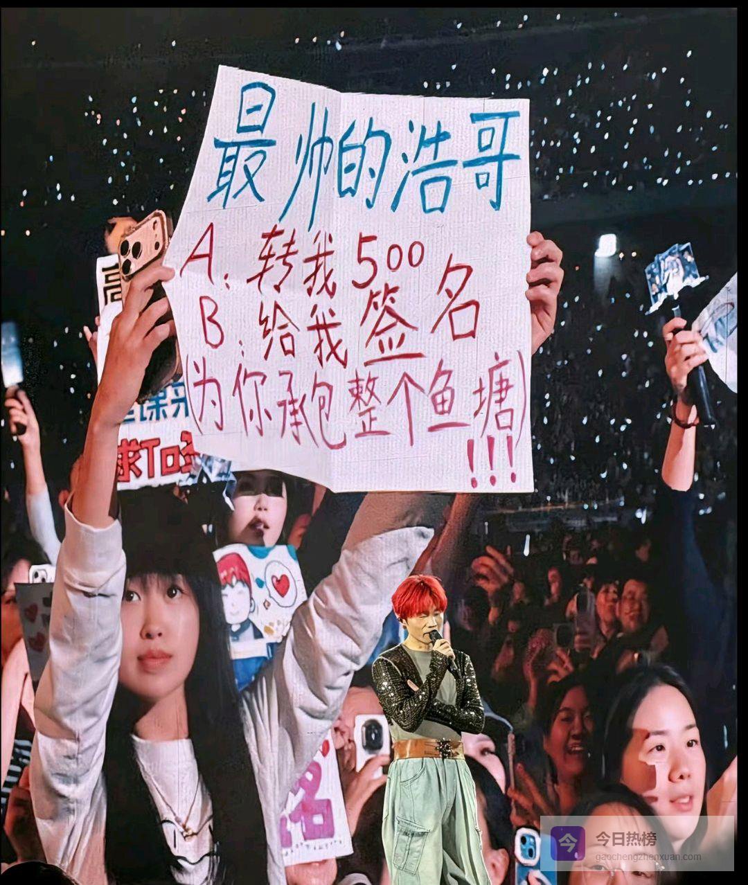 事情的经过简单却极具冲击力。演唱会互动环节,粉丝高举灯牌:“最帅的浩哥:A.转我500 B.给我签名”。这本是饭圈常见的互动套路,通常明星会一笑置之,或者选择性忽略。
