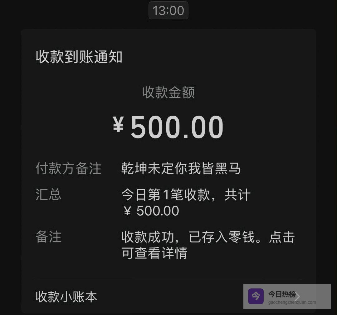 收款截图曝光,付款方备注更是点睛之笔:“乾坤未定你我皆黑马”。