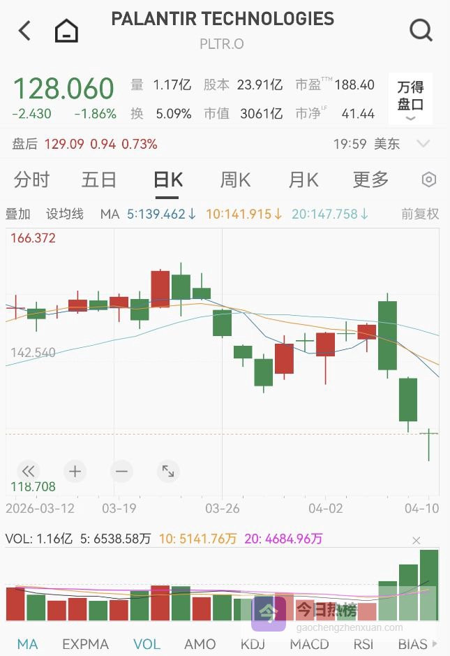 最近三个交易日,Palantir股价持续走低。4月10日,Palantir收跌1.86%,报128.06美元/股;年内跌幅达27.95%。