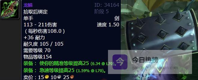 龙鳞是太阳之井高地BOSS菲米丝掉落的单手剑,对于防战来说,龙鳞是必须要拿下的,搭配上黑暗神殿伊利丹的蛋盾,一起扛着别提多英姿飒爽了。因为同时兼顾精准和急速属性,在后期战士T稳定仇恨起到了关键性的作用。那么这时候喵叔的问题就随之而来了,你觉得盗贼打龙鳞打输出如何?