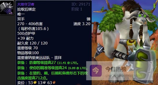 大地守卫者是塞纳里奥远征队声望崇拜的奖励,对于熊德来说,大地守卫者是前中期最完美的精准防御锤子,在当年的TBC版本中,不少熊德玩家为了刷这把锤子,没少收集盘牙武器,当然每日盘牙水库三本潜行也是必不可少,这款双手锤大地守卫者可以说是TBC版本每一个熊T的必须课,那么最后的灵魂拷问强势系列,你知道精准属性和命中的区别不?我们评论区见。