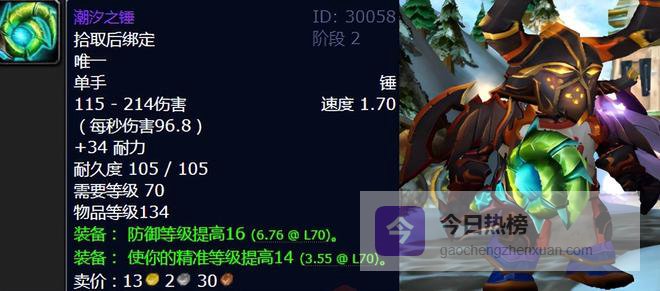 在TBC版本P2阶段,潮汐之锤是防御战士的经典主手武器。它的高耐力、高防御等级和高精准属性组合,完美契合坦克职业在开荒T5副本及海加尔山时的生存与仇恨制造需求。与同期其他坦克武器如卡拉赞掉落的“国王护卫者”相比,潮汐之锤在秒伤、耐力和防御向属性上具有明显优势。可以说是非常实用的一款过渡武器。