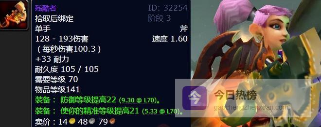 残酷者是黑暗神殿BOSS苏普雷姆斯掉落的单手斧,物品等级141,它的属性非常出色:128-193伤害,速度1.60,每秒伤害100.3, 33耐力,装备后提升22点防御等级与21点精准等级。对于防战来说,残酷者的精准属性能让他们建立更牢固的仇恨。同时,它的防御等级和耐力加成也能提升坦克的生存能力。问题就是如此一款完美到无懈可击的单手斧,喵叔我怀旧服竟然一次都没能够遇见,你敢信?