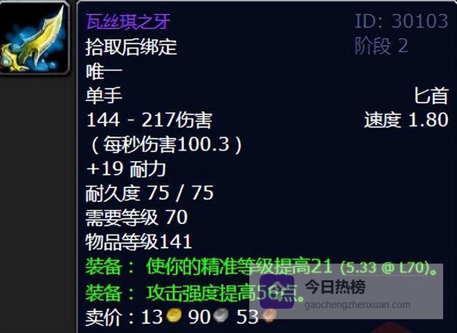 该匕首是毒蛇神殿尾王瓦丝琪掉落的单手匕首,对于近战DPS职业来说,瓦丝琪之牙的精准属性能直接提升攻击的稳定性,减少伤害流失。特别是盗贼玩家阶段性拿了搭配风暴要塞的王子锤使用,输出必然是恐怖如斯直戳天花板的,另外很多双持战士T也会需求他,可以说是非常经典的一款精准匕首了!
