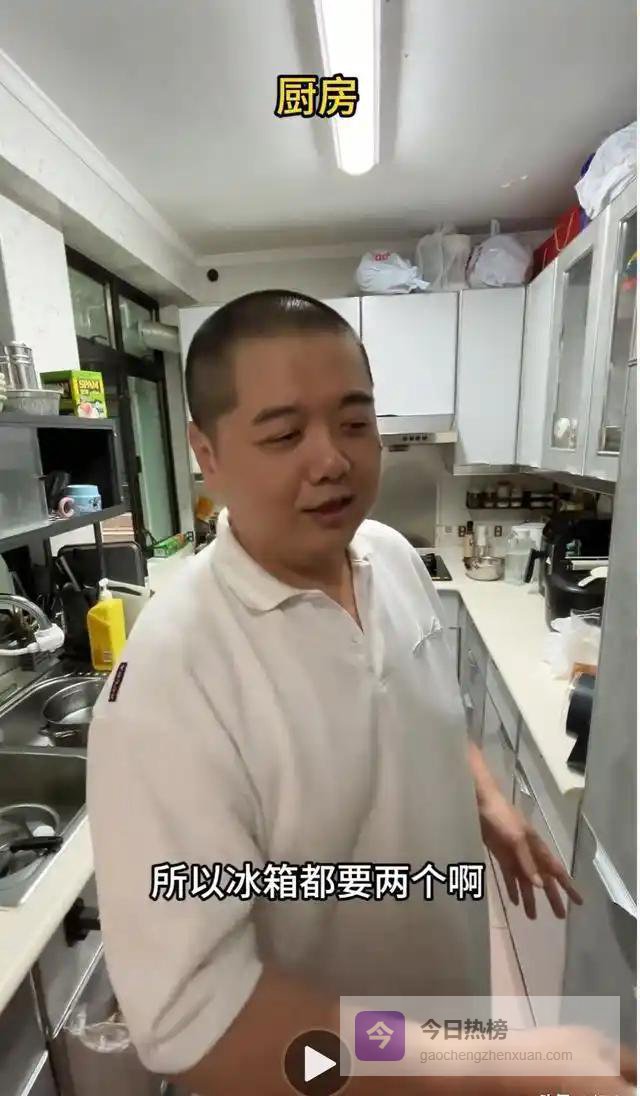 他把镜头往后调,开了广角,特实在地说:"广角开大点,房子能显得大一点。"这话搁内地明星嘴里,几乎不可能说出来。厨房不大,台面塞满锅碗瓢盆,墙上挂满勺子铲子,两个大冰箱杵在那儿抢镜。他说家里人口多,要囤够食材。