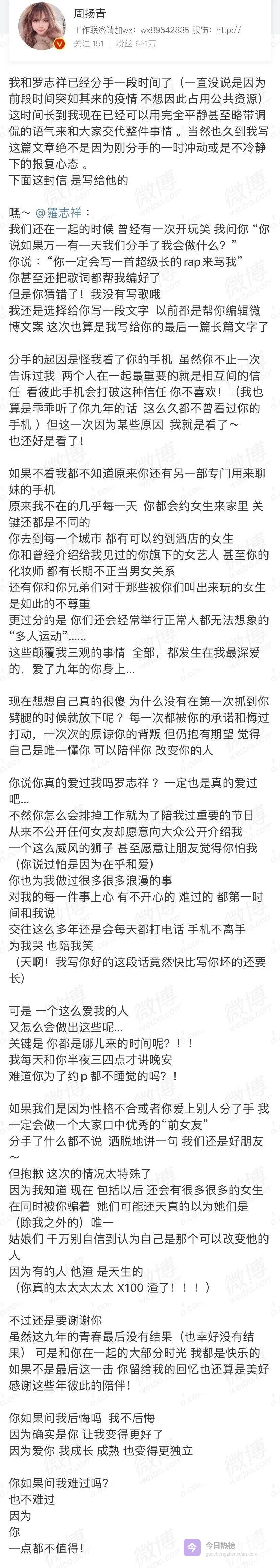 2020年4月23日,相恋九年的女友周扬青发布千字长文,曝光罗志祥长期劈腿、与多人保持不正当男女关系,甚至组织“多人运动”。