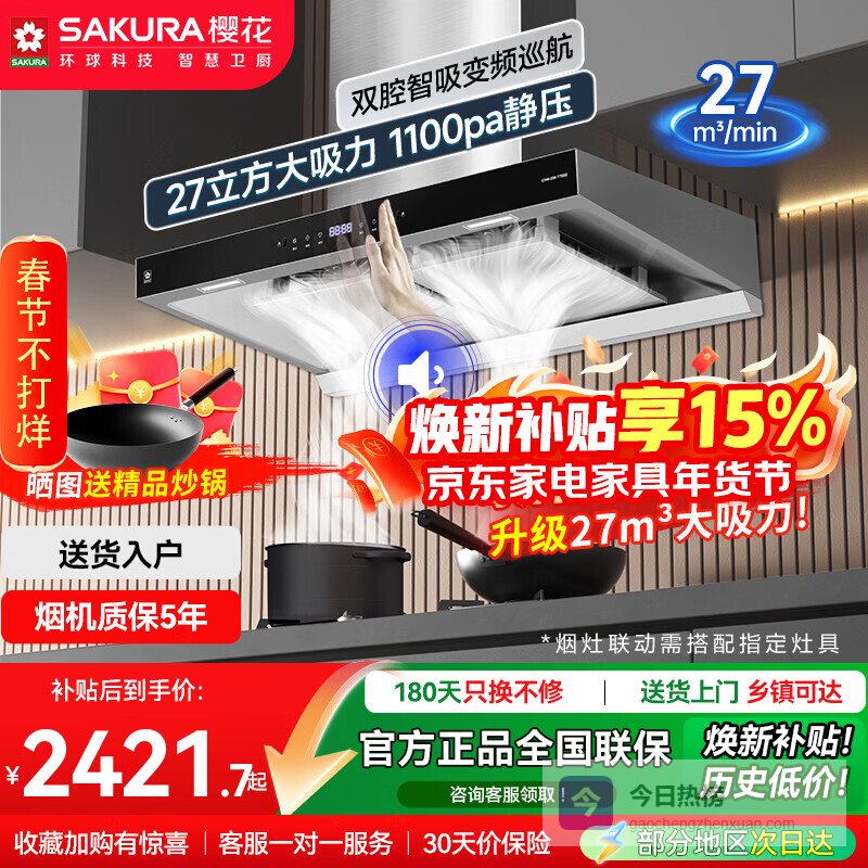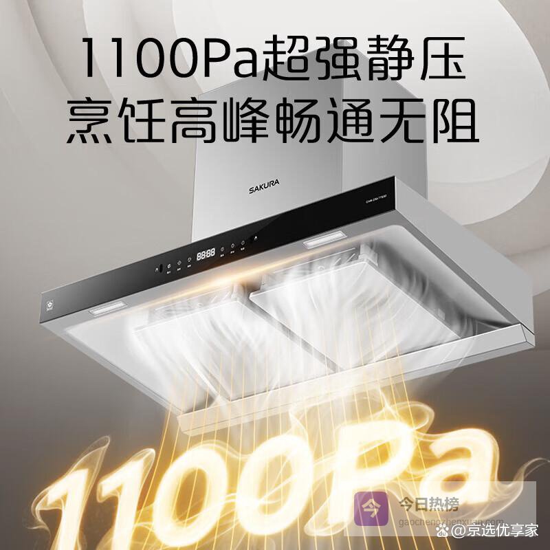樱花(SAKURA)抽油烟机家用27立方大吸力双腔瞬吸变频增压1100Pa超强静压高温自清洁体感挥手智控 CXW-230-TTE02【单烟机】¥