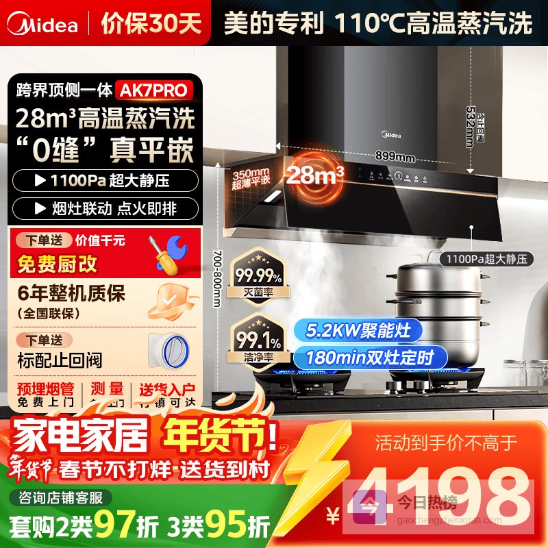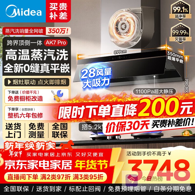 美的(Midea)【蒸汽洗AK7PRO/AK5PRO】抽吸排油烟机家用28风量大吸力顶侧一体变频自清洁高温蒸汽洗齐平橱柜 【热销爆款套装】AK7PRO+QD529双定时燃气灶 烟灶联动【享以旧换新补贴】¥