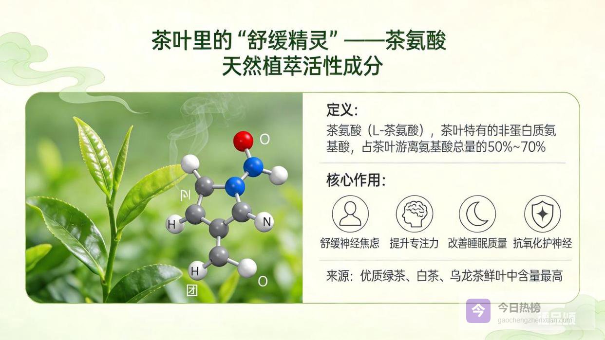 茶叶茶氨酸(源自绿茶):温柔的“情绪安抚师”。它能帮助舒缓神经,缓解因压力、焦虑导致的皮质醇水平升高,从而间接保护胶原蛋白,对抗“压力型衰老”。