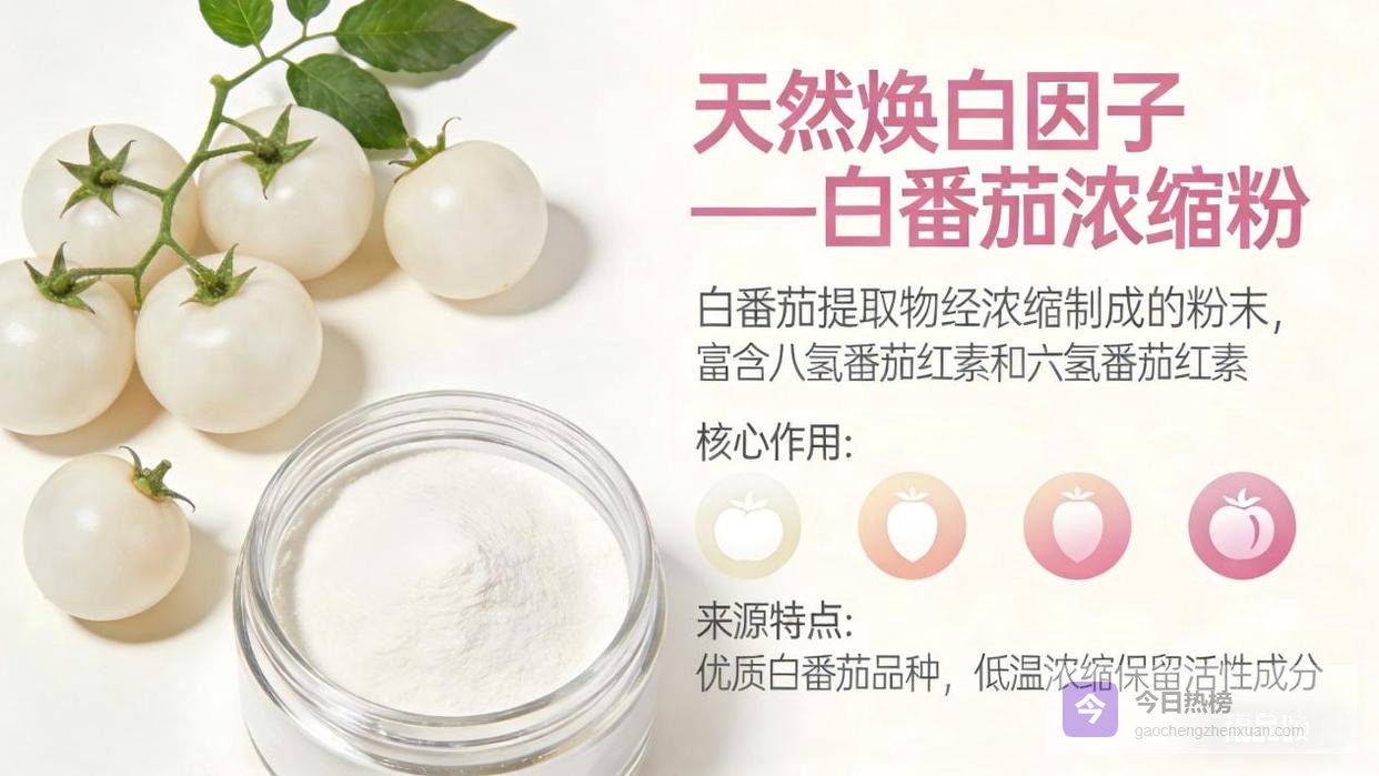 白番茄浓缩粉:富含特殊的八氢番茄红素等稀有成分,被研究发现能针对性帮助肌肤抵御紫外线等光辐射带来的伤害,是内在的“光防护盾”。