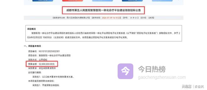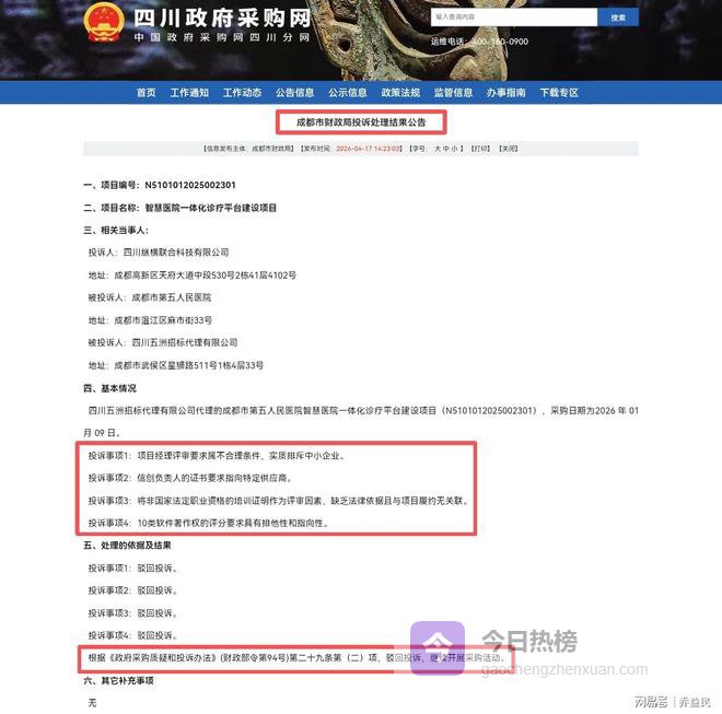 成都市第五人民医院一个3200万元采购项目,在发布招标公告后,接连遭到两起投诉!最终,财政部门认定,投诉部分成立,责令重新开展采购!近日,《四川政府采购网》在监管信息栏发布两则《成都市财政局投诉处理结果公告》,揭开了这起医疗采购投诉案。2026年1月9日,四川五洲招标代理有限公司发布《成都市第五人民医院智慧医院一体化诊疗平台建设项目招标公告》,预算金额为3200万元,最高限价3139万元,开标时间定于2026年2月2日上午10点。