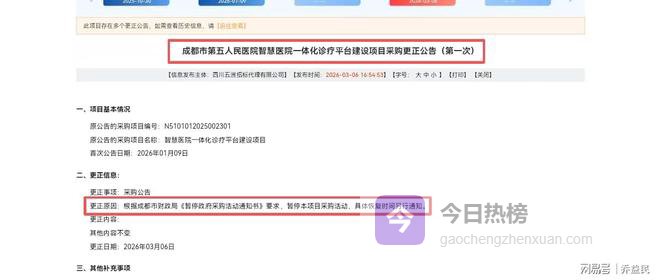 而正是上述这些业绩与证书要求,以及人员资质证书颁发机构的设置,成为了日后投诉的导火索。就在开标前一天,即2026年3月3日,该项目发布第二次更正公告,对采购文件再次进行调整,同时将开标时间推迟为2026年3月19日上午10点。不料,就在3天后,该项目再次发布更正公告称,根据成都市财政局《暂停政府采购活动通知书》要求,暂停本项目采购活动,具体恢复时间另行通知。